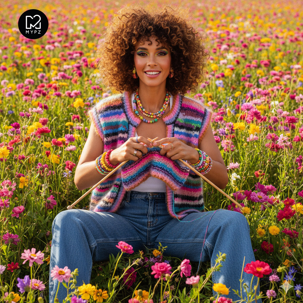 The vest in the picture is knitted with random colors of MYPZ Chunky kidmohair DK in different lengths. You can use our Left Over Bundle to knit a piece like this.